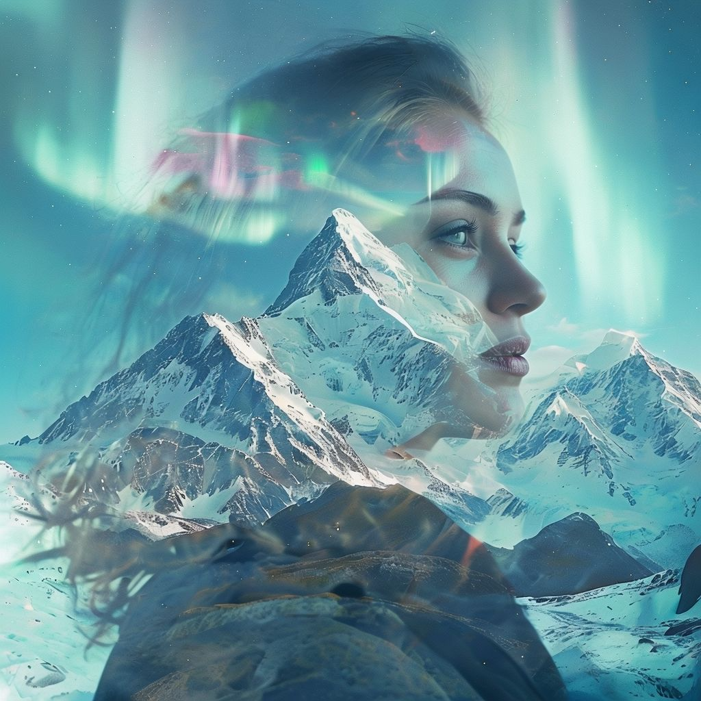 🖌️ Prompt : “A double exposure portrait combining a woman’s profile with a majestic snowy mountain landscape. Dreamy atmosphere, northern lights in the sky, ethereal aesthetic, trending on ArtStation”