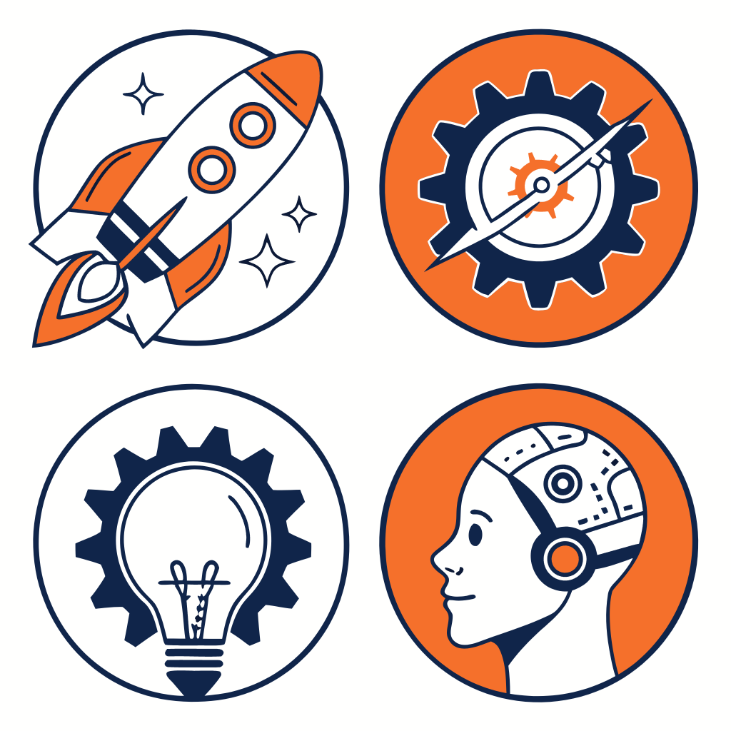 🖌️ Prompt : “A set of 4 flat vector icons specifically designed for a tech startup: a rocket ship, a lightbulb, a gear, and a robot head. Minimalist design, clean lines, orange and navy blue color palette, white background.”