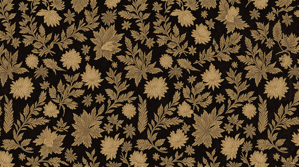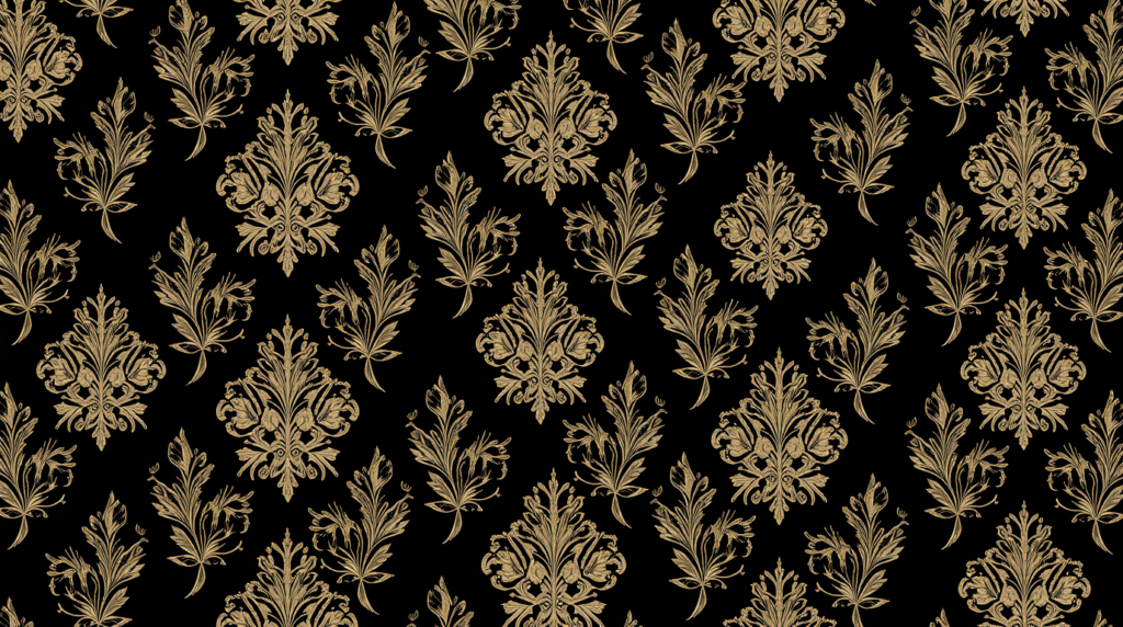 🖌️ Prompt : “Intricate seamless floral pattern, luxury gold and black velvet texture. Victorian style, detailed baroque elements, wallpaper design, 8k.”